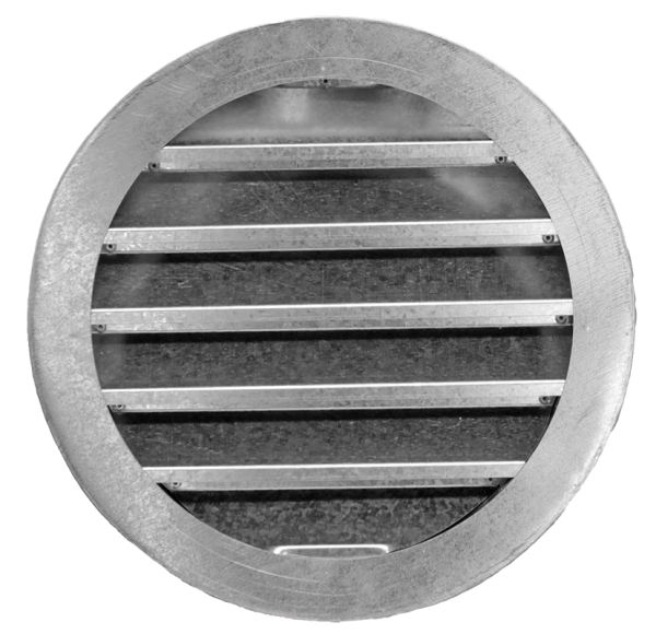 Στόμιο κυκλικό βροχής-νωπού από γαλβανισμένο χαλυβδοέλασμα με σταθερά πτερύγια κλίσης 45ο και πλέγμα γαλβανισμένο (6X6 mm) στο πίσω μέρος που εμποδίζει την είσοδο ξένων σωμάτων. Κατάλληλο για τη λήψη ή την απόρριψη αέρος από ή σε εξωτερικούς χώρους. Στήριξη με ορατές βίδες. Είναι δυνατή η ηλεκτροστατική βαφή σε χρώμα RAL.