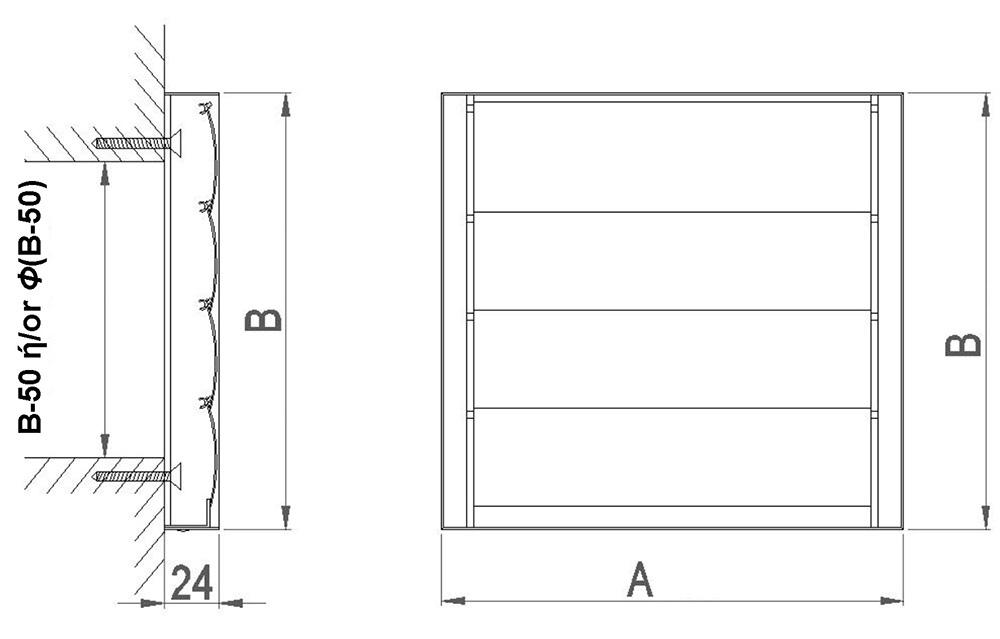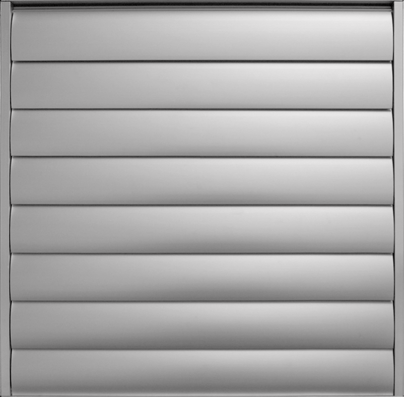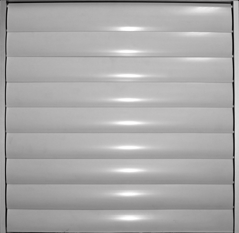 Στόμιο τοίχου, βαρύτητας χωρίς πλαίσιο με μια σειρά πτερύγια από αλουμίνιο για απόρριψη του αέρα λόγω υπερπίεσης. Είναι δυνατή η ηλεκτροστατική βαφή σε χρώμα RAL.
