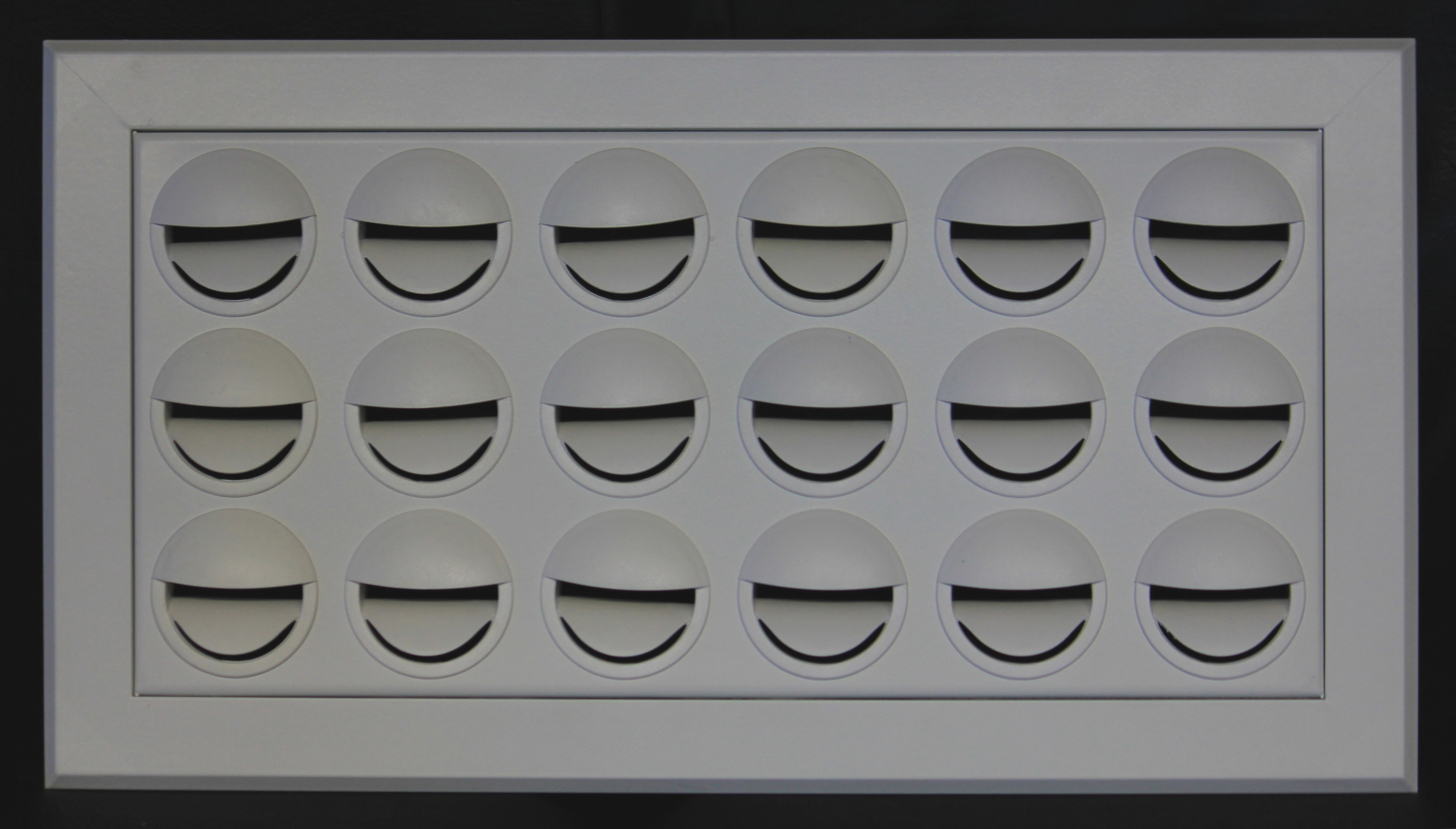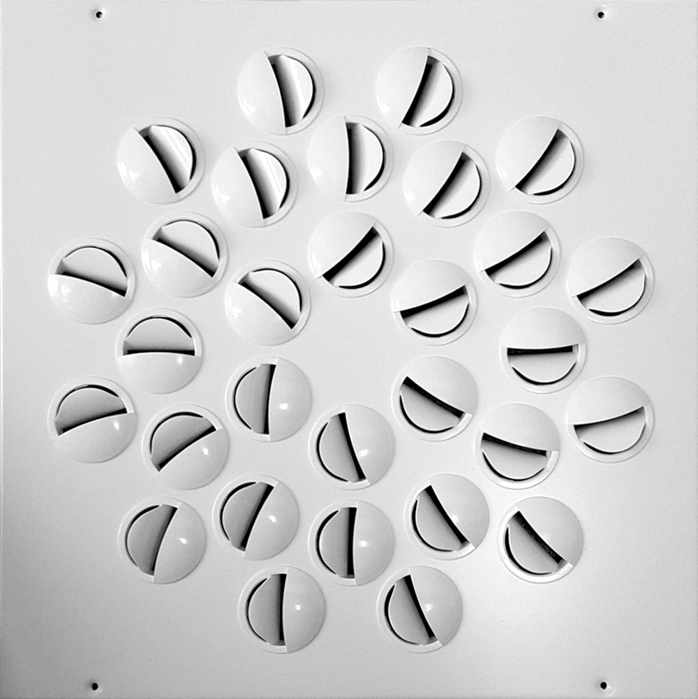 Στόμιο οροφής/τοίχου πολλαπλών κατευθύνσεων με ανεξάρτητα ρυθμιζόμενα πλαστικά ακροφύσια. Το πλαίσιο είναι από χαλυβδοέλασμα βαμμένο ηλεκτροστατικά σε χρώμα RAL. Τα ακροφύσια είναι λευκά.