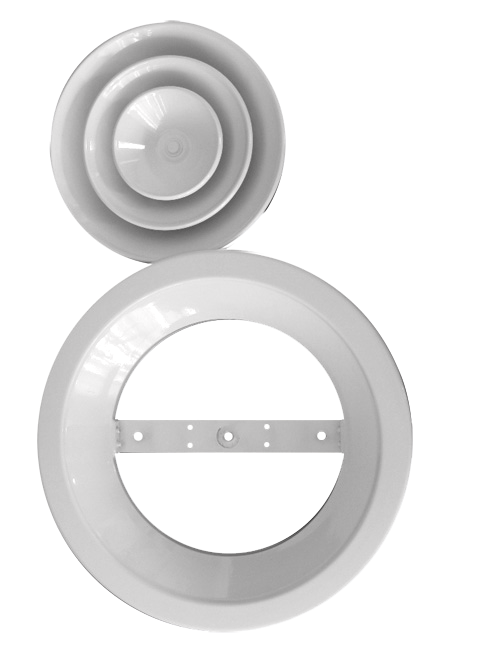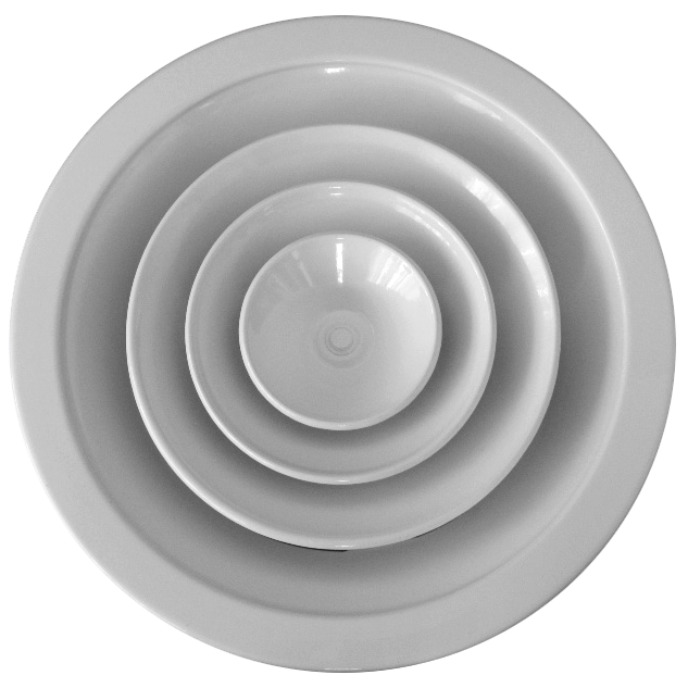 Στόμιο κυκλικό οροφής, προσαγωγής ή επιστροφής, με σταθερά ομόκεντρα αφαιρούμενα πτερύγια (ανεμοστάτης). Κατασκευασμένο από αλουμίνιο ανοδιωμένο ή βαμμένο ηλεκτροστατικά λευκό RAL 9010. Είναι δυνατή η ηλεκτροστατική βαφή και σε άλλα χρώματα RAL. Η στήριξη είναι κρυφή με πλαίσιο σχήματος ‘Π’. Ο αέρας προσάγεται ομοιόμορφα προς όλες τις κατευθύνσεις (360°). Χρησιμοποιείται σε εφαρμογές ψύξης και για χαμηλά ύψη σε εφαρμογές θέρμανσης. Τοποθετείτε με πλένουμ μποξ.