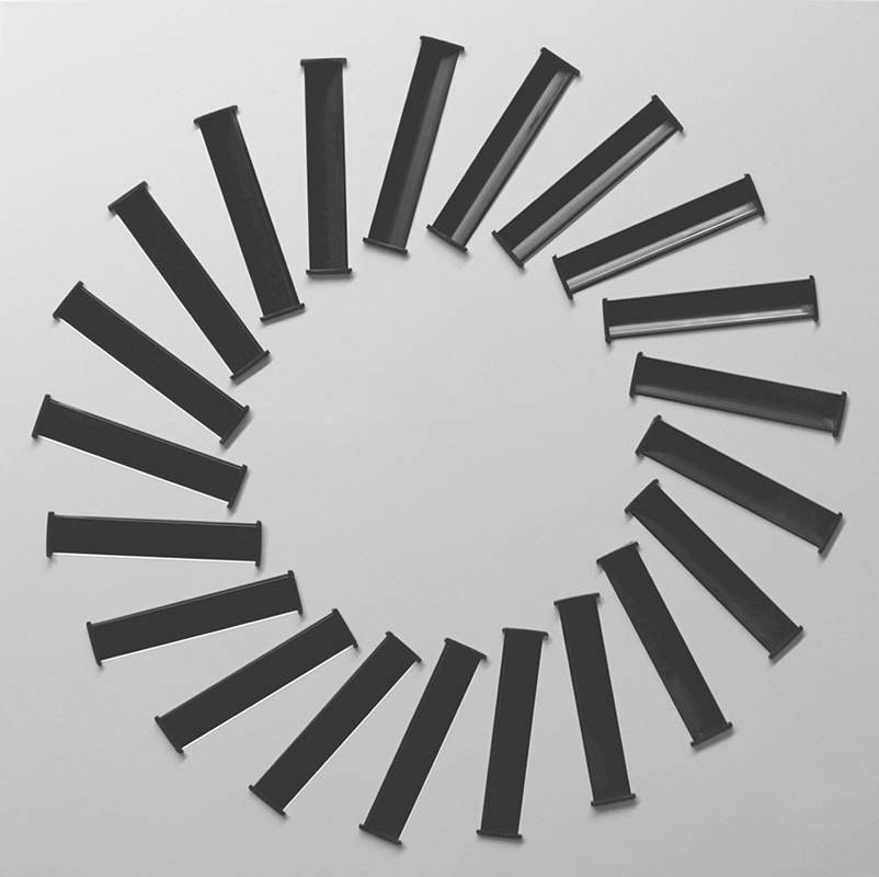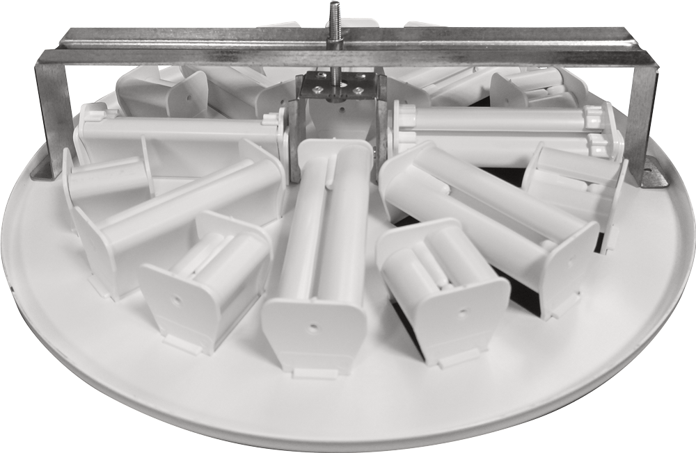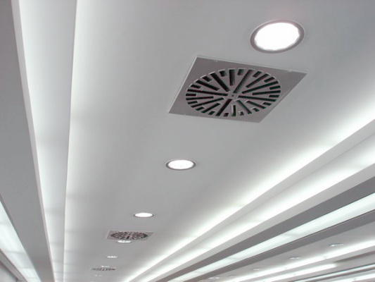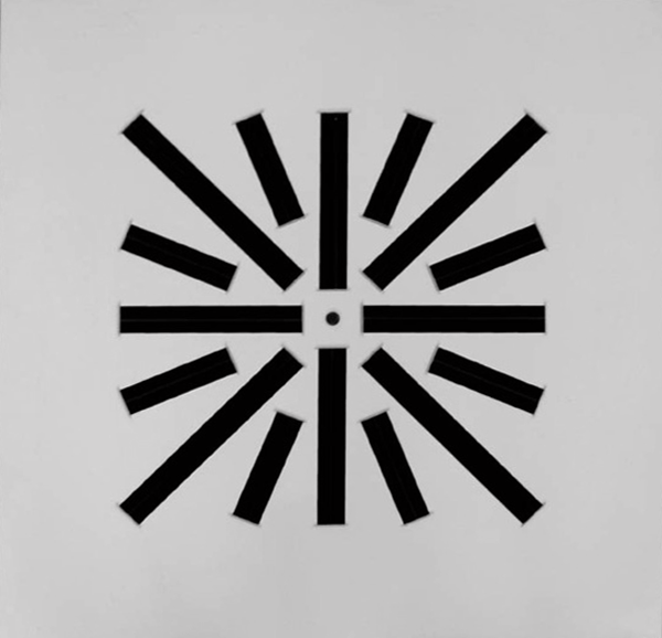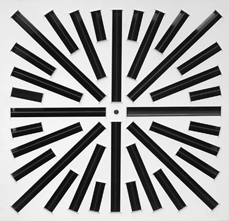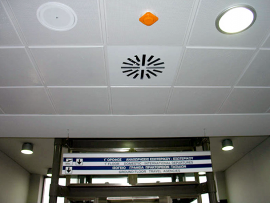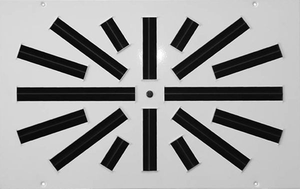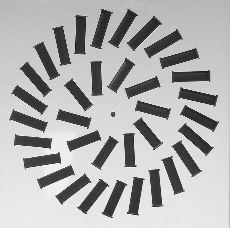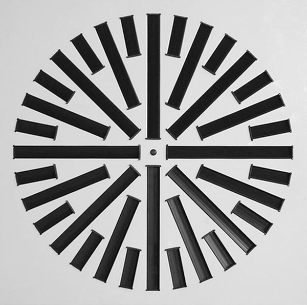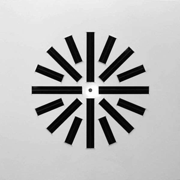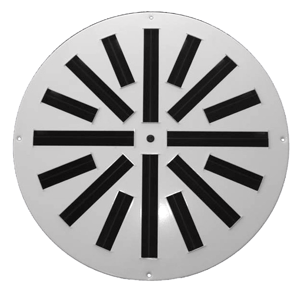 Ceiling swirl diffuser, for supply air, with front plate made by steel sheet electrostatically painted in RAL color or anodized aluminium in natural color. With openings for air distribution radial placed. In each opening there is one blade plastic, in color black RAL 9005 or white RAL 9010. The blades are adjustable manually for regulation of the air jet pattern. For use in heating and cooling cases. For low up to high installation height and air volume supply. In the swirl mode he air is supplied in the same way to all directions (360o).