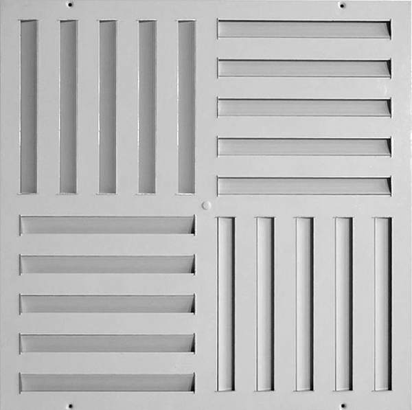 Ceiling diffuser, for supply air, with four directions air jet. Square front plate made by steel sheet electrostatically painted in RAL color or anodized aluminium in natural color. With openings for air distribution placed in four groups. In each opening there is one blade plastic, in color black RAL 9005 or white RAL 9010. The blades are adjustable manually for regulation of the air jet pattern. For use in heating and cooling cases. For low up to high installation height and air volume supply. Noise and pressure drop remains the same in any position of the blades.