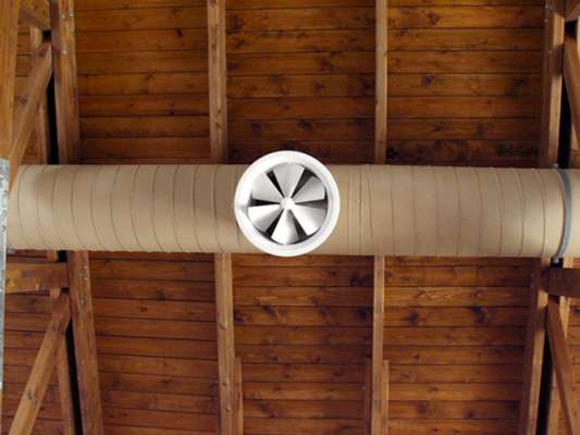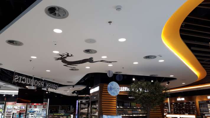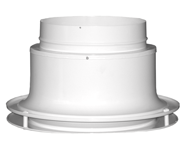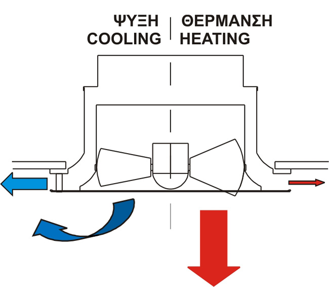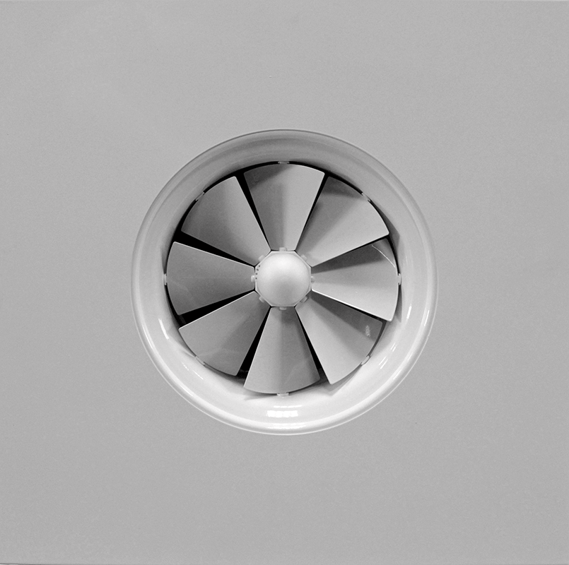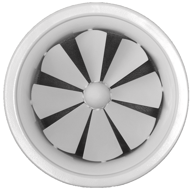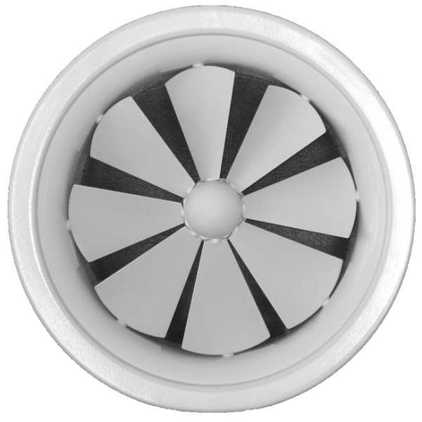 Round, supply air, swirl diffuser. For use in heating and cooling cases. For low up to high installation height and air volume supply. The air is supplied in the same way to all directions (360o). With frame made by aluminium and eight trapezoid adjustable blades made by steel sheet. The blades are simultaneously rotated, for alteration of the air jet. Painted in RAL color. In the center there is a removable cup, when we remove it we see an arrow which indicates the angle of the blades. Installation in false ceiling or visible air duct is possible. The regulation of the blades angle is manual.