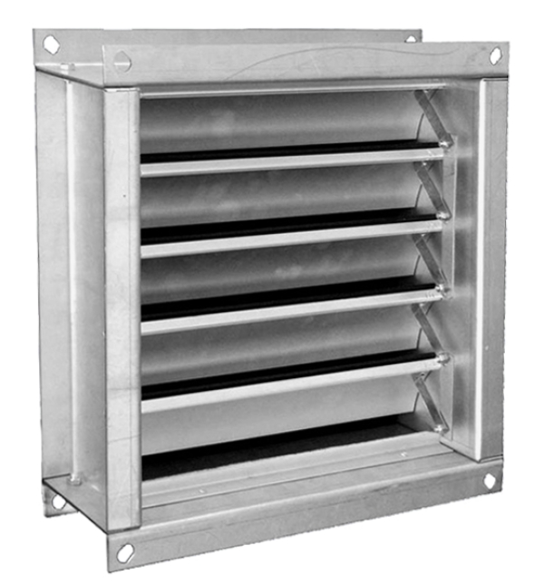 Gravity damper for installation in square or rectangular air ducts. For air extraction because of overpressure. The frame is made by galvanized sheet steel. With blades made by anodized aluminium. The blades in the length they have seals in rubber for noise reduction when the damper is closing. If the damper has three or more blades then they are bridged for smoother operation. The blades are parallel to the first mentioned dimension.